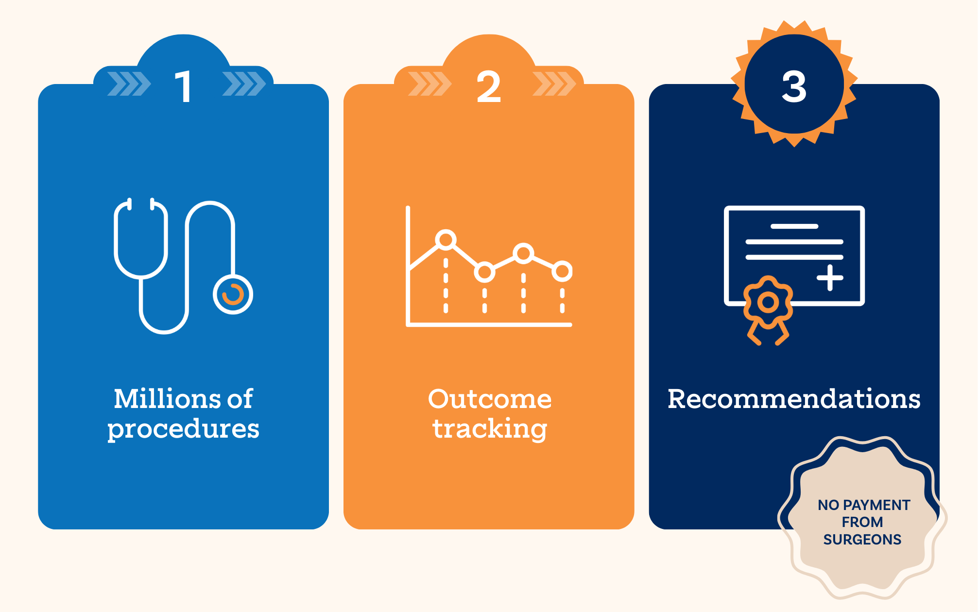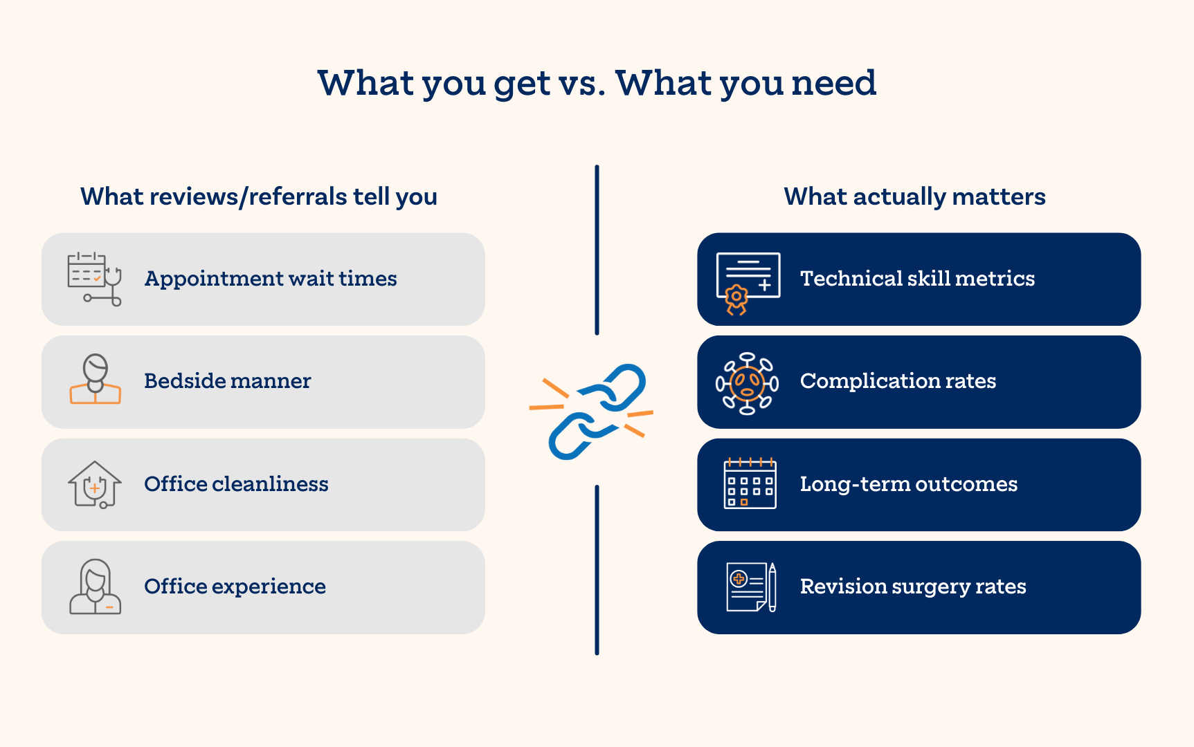 Review sites might tell you that a surgeon has a pleasant bedside manner and a nice office. But they won’t tell you that the same surgeon has infection rates three times higher than average. Your primary care doctor might refer you to a surgeon because they work at the same hospital system. Not because they’ve analyzed that surgeon’s problem data.